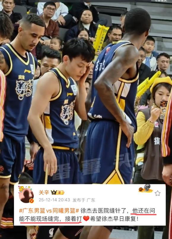 比赛还在进行中,但是广东队跟队记者关辛透露,“徐杰去医院缝针了”。受伤后徐杰一句话足以让所有人动容,此时他没把伤放在心上,而是想着球队,问队医:“能不能现场缝完,接着打”,此言真是催人泪下,这孩子心中没有自己,只装着球队。