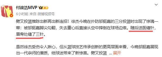 - 徐杰最新伤情报告!眉骨缝了数针,社媒发声彰显担当,杜锋祈祷